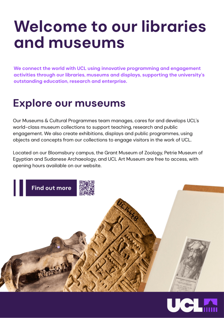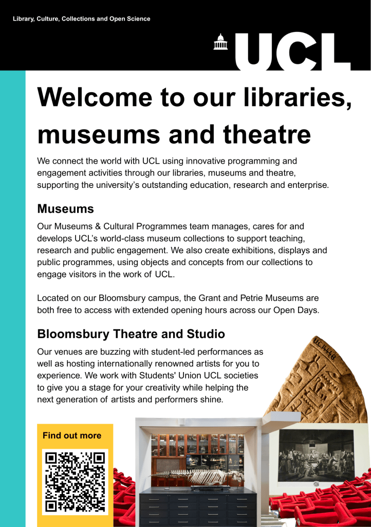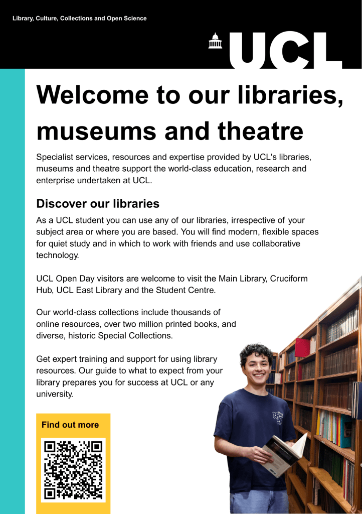 Print Revamp of UCL LCCOS libraries and museums poster used for different key touchpoints over the academic year such as induction and Open Days. The designs were adapted to suit the UCL brand refresh. Before After
